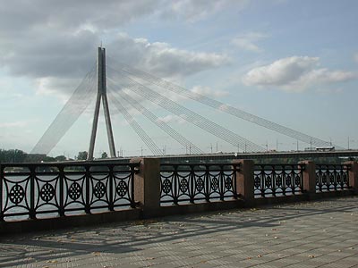 ...eine weltmännische Atmosphäre aus. An der Daugava, diesem riesigen Fluss, in den der Rhein sicherlich mehrfach hineinpassen würde ist dann auch die entsprechend symbolhafte Architektur wie die faszinierende Hängebrücke...